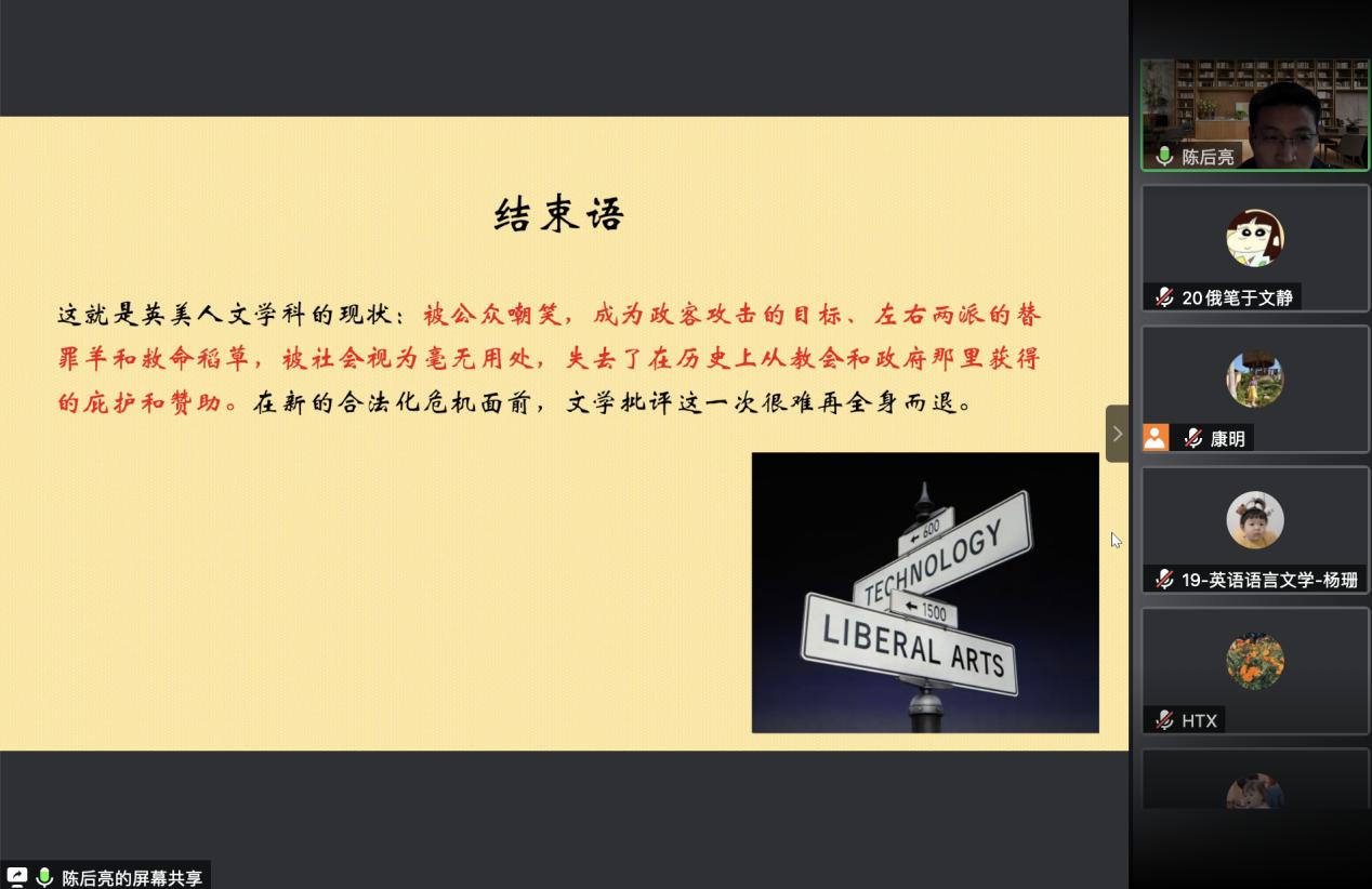 讲座伊始,陈后亮表示,在当今时代背景下,人文学科面临着百年未有之大变局,在西方面临着被边缘化的巨大危机。相较于西方英文系过去的辉煌,如今其影响力的断崖式下降不禁令人唏嘘。随后,陈后亮老师阐释了合法化的概念,即找到存在价值,进行自我辩护,为其存在的合理性提供一个不加质疑的理由。文学专业较其他学科专业与非专业的界限模糊,且其研究价值和社会效益无法量化显示,这种种就导致了文学研究的合法性问题。陈后亮列举了20世纪文学批评自我合法化的三个阶段,即19世纪末20世纪初文学代替宗教起到粘合国民性的精神引领作用;二战后现代艺术、经济复苏、婴儿潮的出现使文学批评及英文系摆脱了合法性危机;二十世纪八十年代至二十世纪末文学批评成为社会革命的替代品,以寄托革命热情。最后,陈后亮阐释了当代文学研究的再合法化难题,以卷土重来的新自由主义为背景,货币化、数字化为特征的新管理主义使得市场需求成为衡量学科存在价值的标杆。生存空间的压缩,经费的紧缩,投入和产出的不平衡,文学批评的基础——读者群体的减少,这些让西方的英文系学者发出绝望而又徒劳的哀嚎。