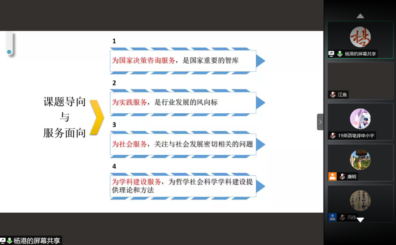 讲座伊始,杨港表示,教学实践与教学研究密不可分,要善于发现教学中存在的现象,将其凝练成具体的研究问题并选用适切的理论和方法来指导研究。从教学现象到科研产出,一般要经过三个步骤,即敏锐的选题挖掘、系统的文献研究、适切的方法选用。课题的申请要经过选题、论证、研究基础等过程,最后确定是否可以入围。杨港提出,外语教学实践求新求变,外语教学研究常变常新。