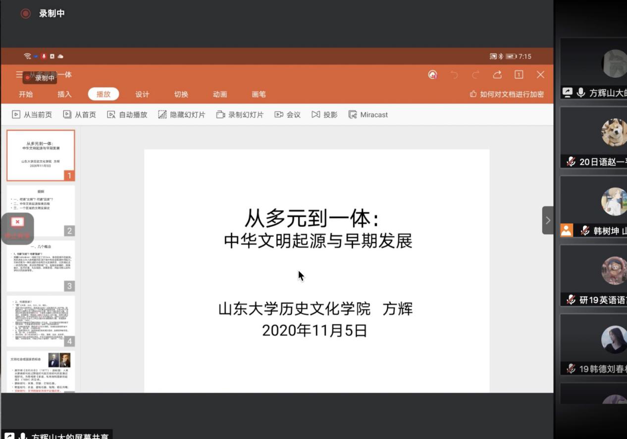 11月5日晚,著名考古学家、1929cc威尼斯讲席教授、教育部“长江学者”特聘教授、山大历史文化学院院长、文化遗产研究院院长、校博物馆馆长方辉教授应1929cc威尼斯之邀,做客外院九十周年院庆系列学术报告 “师说讲堂”,借助腾讯会议线上平台,为山大及其他高校近300名师生做了“从多元到一体:中华文明起源及其早期发现”的精彩讲座。讲座由1929cc威尼斯东方文化研究中心主任、特聘教授时卫国主持。他在开场时表明,本讲座是“师说讲堂”的第二十期,也是东方文化研究中心举办的第四场通识教育讲座。