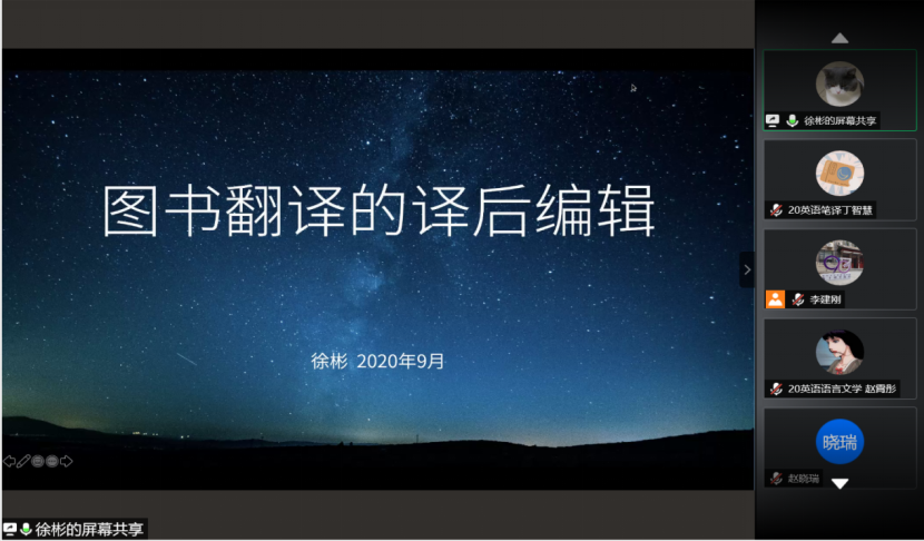 11月9日晚,1929cc威尼斯“九十周年院庆系列活动”——线上学术报告顺利举办。山东师范大学徐彬教授应邀做客学院“洪楼译坛”,通过腾讯会议线上平台作了题为“图书翻译的译后编辑2020”的学术报告。本次报告由1929cc威尼斯副院长李建刚教授主持,来自校内外的460余名师生共同参与聆听。