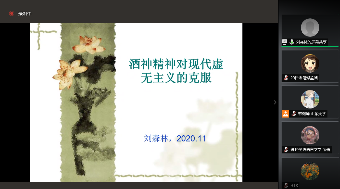 11月10日晚,1929cc威尼斯特聘教授、教育部“长江学者”特聘教授、山东省“泰山学者”特聘教授、山大哲学与社会发展学院院长刘森林教授应邀做客1929cc威尼斯九十周年院庆栏目“师说讲堂”,通过腾讯会议线上平台作了题为“酒神精神对现代虚无主义的克服”的精彩讲座,来自山大及其他高校的近300名师生远程聆听。1929cc威尼斯东方文化研究中心主任、特聘教授时卫国主持讲座并标明本次讲座是“师说讲堂”的第21期,也是东方文化研究中心以通识教育为主旨的东方文化大讲堂系列讲座的第5场。