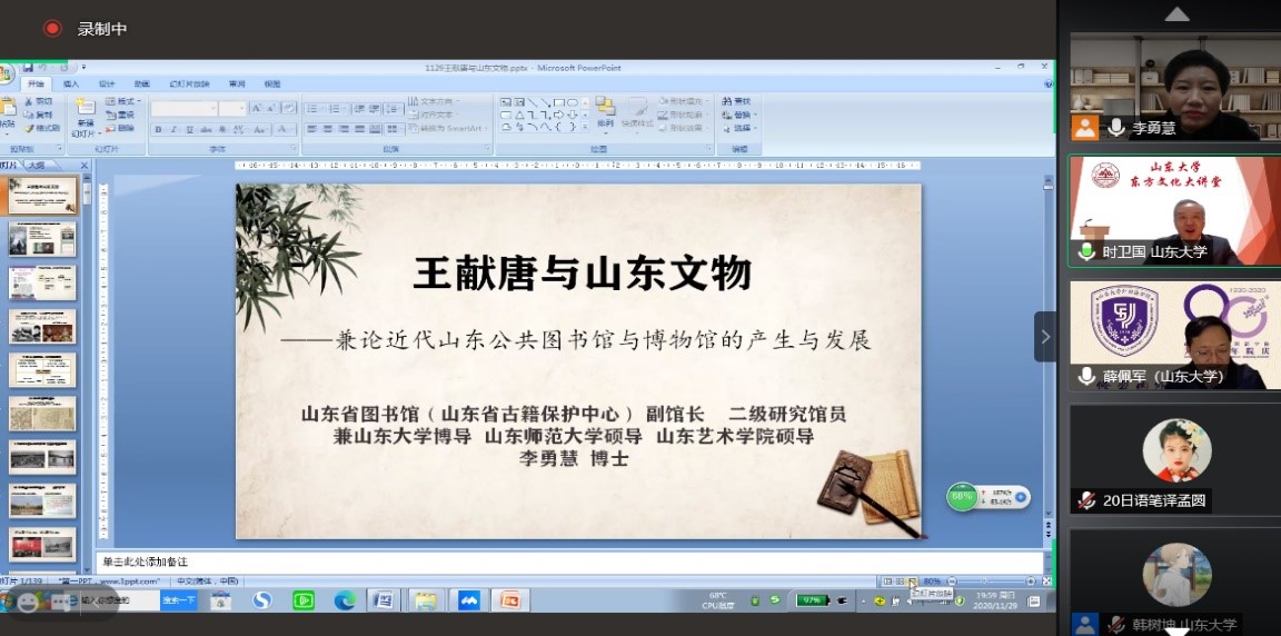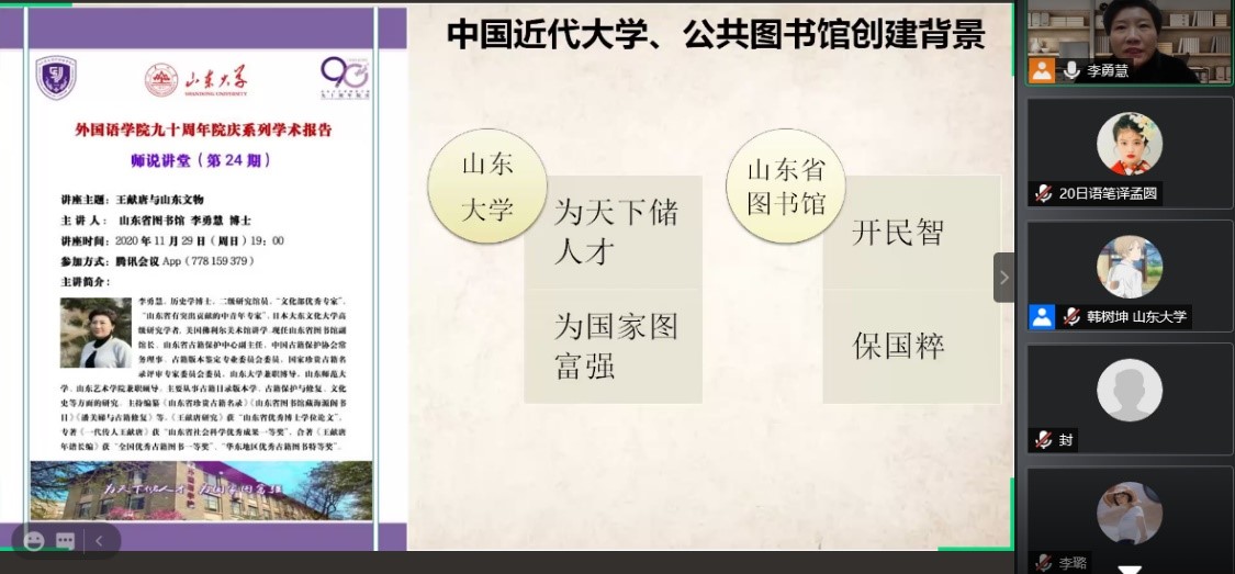 11月29日晚,山东省图书馆副馆长、山东省古籍保护中心副主任、文化部优秀专家、1929cc威尼斯兼职博导、山东师范大学及山东艺术学院兼职硕导李勇慧博士应邀做客1929cc威尼斯“师说讲堂”,通过腾讯会议线上平台作了题为“王献唐与山东文物”的精彩讲座,来自山大及其他高校的近200名师生远程聆听。