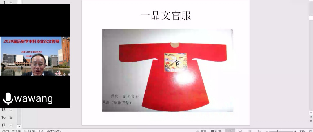 黑龙江大学教授、日本名古屋大学博士高芃赞扬王教授知识丰富,演讲令在线师生们沉醉于江南服饰和官服的有趣与美妙之中,且久难忘怀;其生动、形象地讲述明代后期服饰变化的成因,相对于服饰本身的实用价值和审美意义,其政治意义和等级意义更显重要。