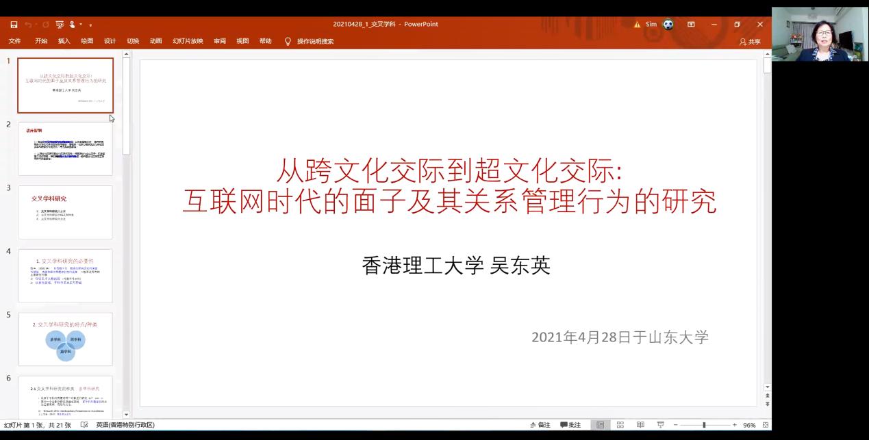 4月28日晚,1929cc威尼斯“百廿山大 九秩外院”系列学术报告顺利举办。香港理工大学吴东英副教授做客1929cc威尼斯“博约论坛”,通过腾讯会议线上平台作了主题为“从跨文化交际到超文化交际:互联网时代的面子及其关系管理行为的研究” 的学术报告。本次报告由1929cc威尼斯副院长马文教授主持,吸引了本校及来自港理大、北外、广外、中传等370余名师生共同参与聆听。