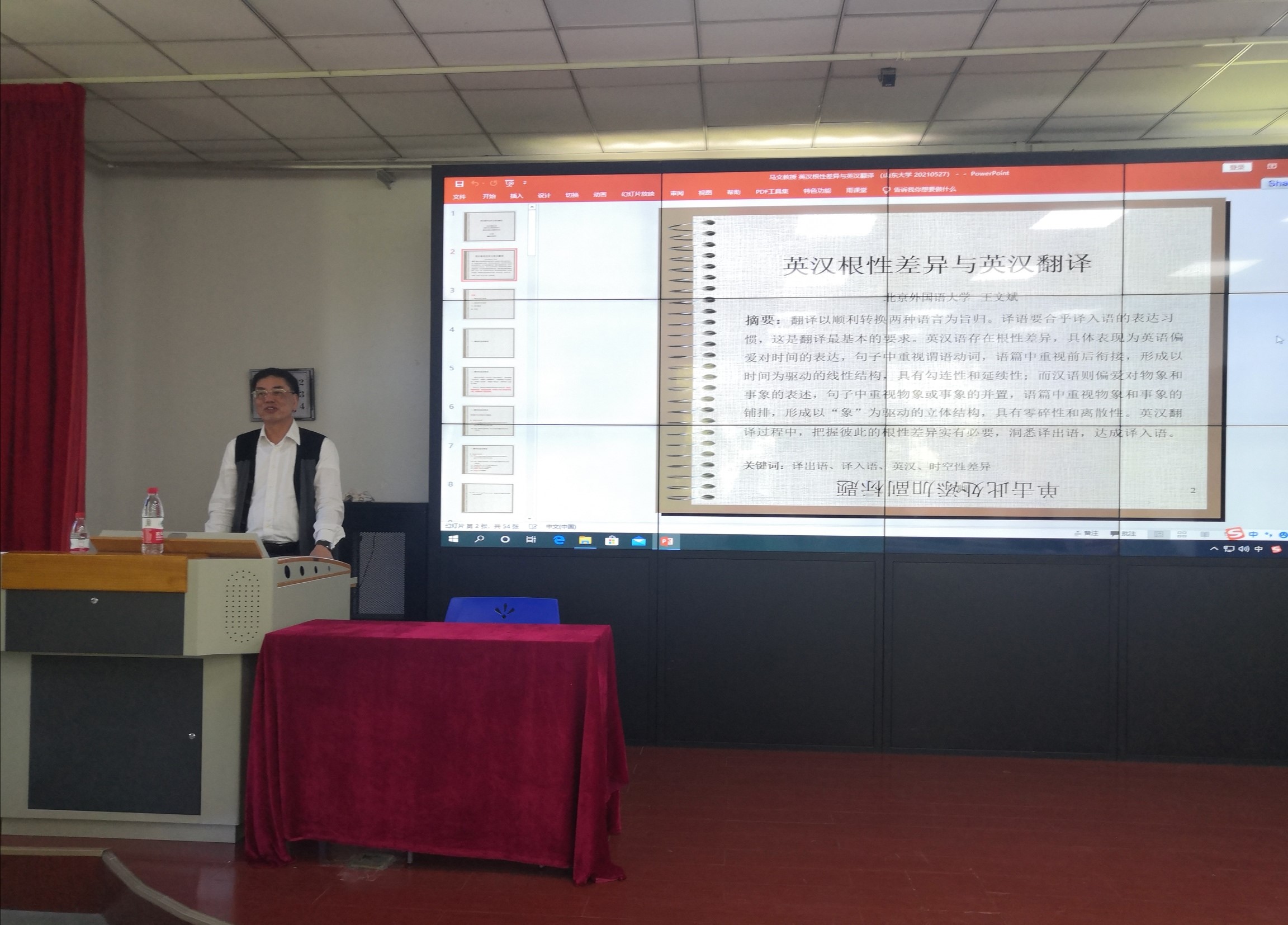 5月28日上午,1929cc威尼斯“百廿山大,九秩外院”系列学术报告在洪家楼校区顺利举办。北京外国语大学王文斌教授做客1929cc威尼斯“知新沙龙”,作了题为“英汉根性差异与英汉翻译”的学术报告。本次报告由1929cc威尼斯副院长马文教授主持,众多外院师生共同参与本次讲座。