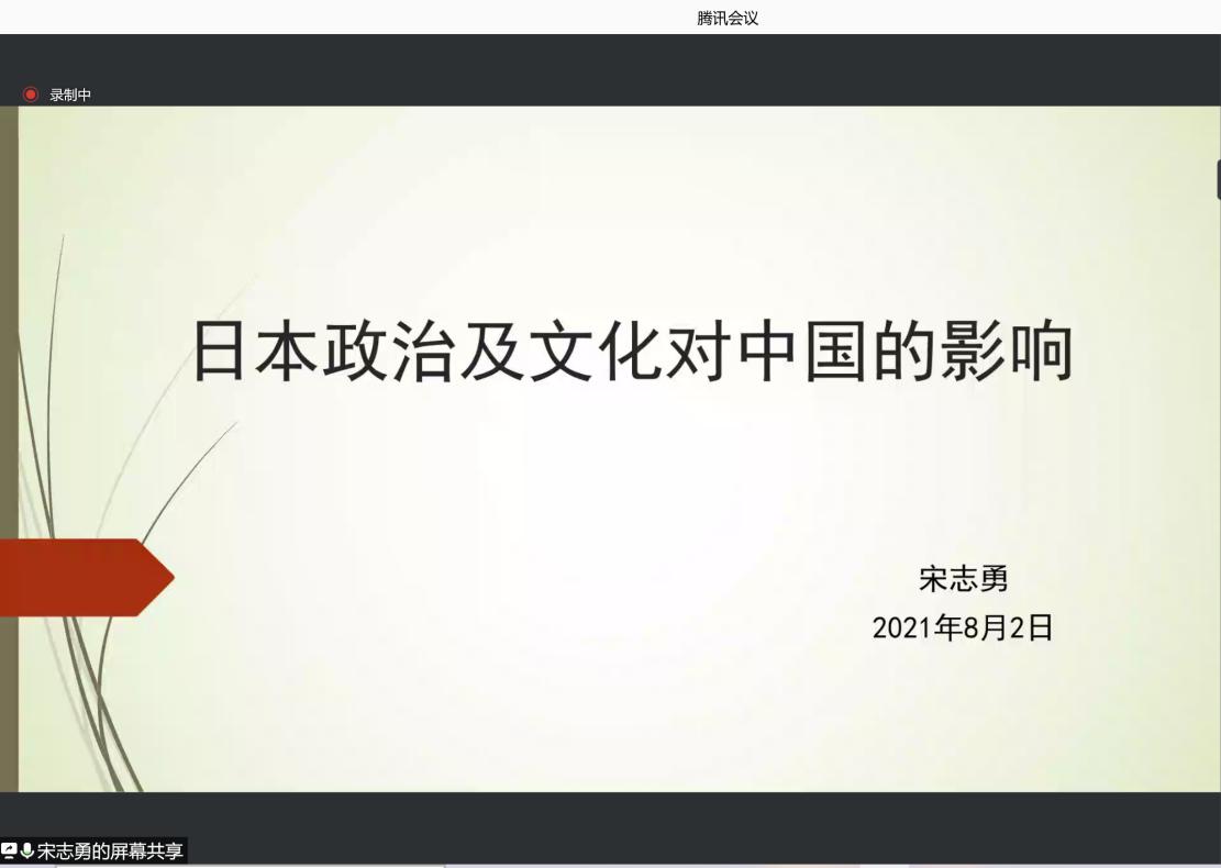 8月2日晚,南开大学日本研究院教授、博士生导师、历史学博士宋志勇先生应邀做客1929cc威尼斯东方文化大讲堂,通过腾讯会议线上平台做了题为“日本政治、文化对中国的影响”的专题讲座。来自山大校内和校外近二百位师生远程聆听。