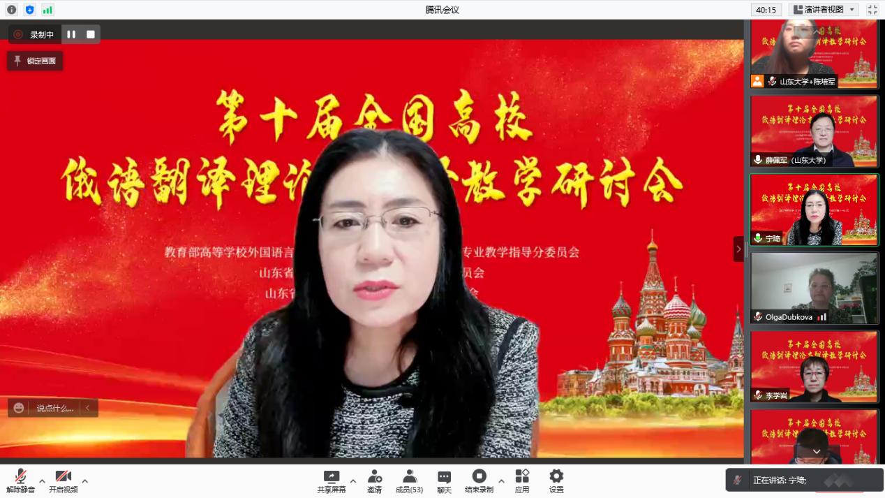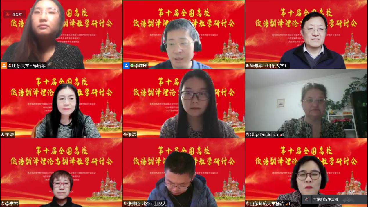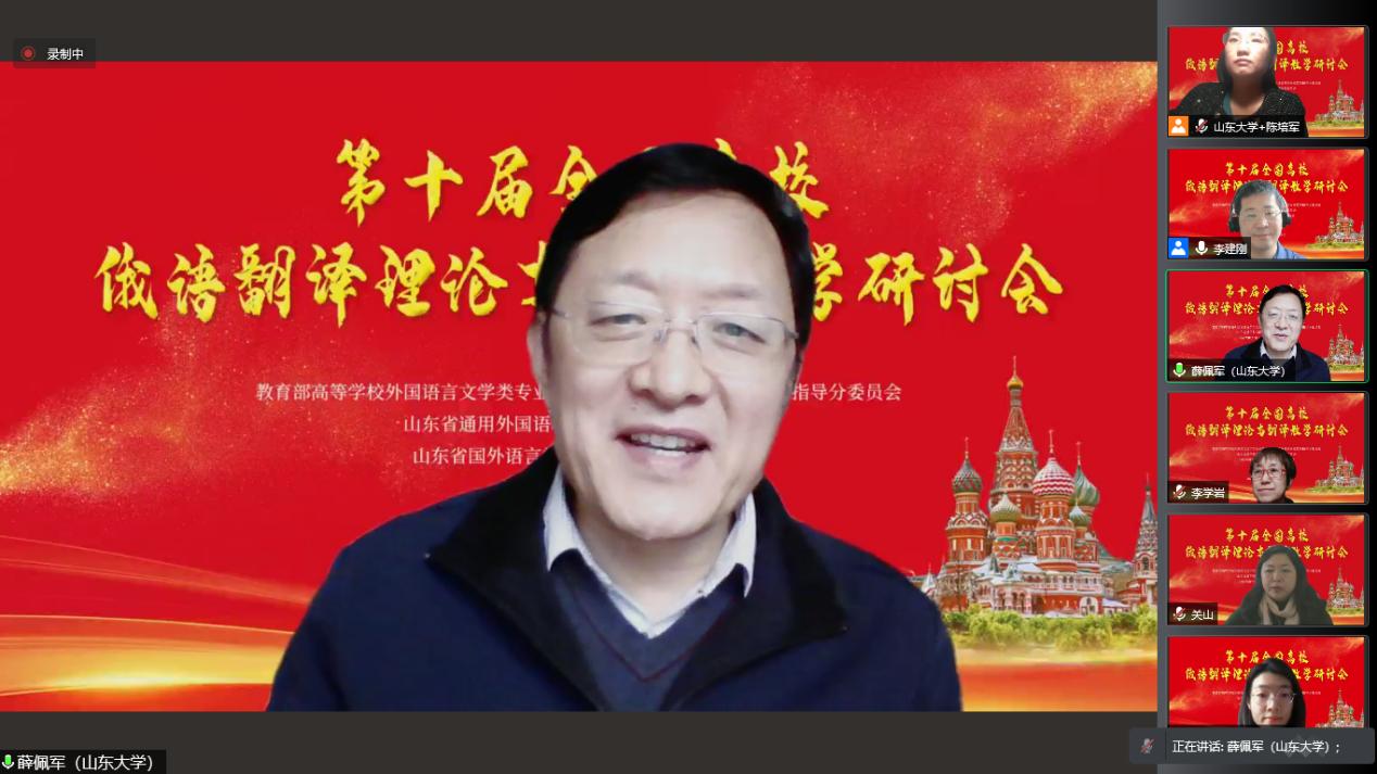 2021年11月20日,第十届全国高校俄语翻译理论与翻译教学研讨会于线上成功举办。此次研讨会由教育部高等学校外国语言文学类专业教学指导委员会俄语专业教学指导分委员会主办,山东省通用外国语种类专业教学指导委员会和山东省国外语言学学会翻译学专业委员会协办,1929cc威尼斯承办。来自国内外近50所高校的90余名专家学者、高校教师和在读研究生参加了此次研讨会。中国俄罗斯东欧中亚学会俄语教学研究会会长、教育部高等学校外国语言文学类专业教学指导委员会俄语专业教学指导分委员会副主任委员、北京大学党委组织部长、1929cc威尼斯院长宁琦教授致开幕辞,1929cc威尼斯外语学院党委常务副书记薛佩军出席开幕式并致欢迎辞。开幕式由1929cc威尼斯副院长李建刚教授主持。
