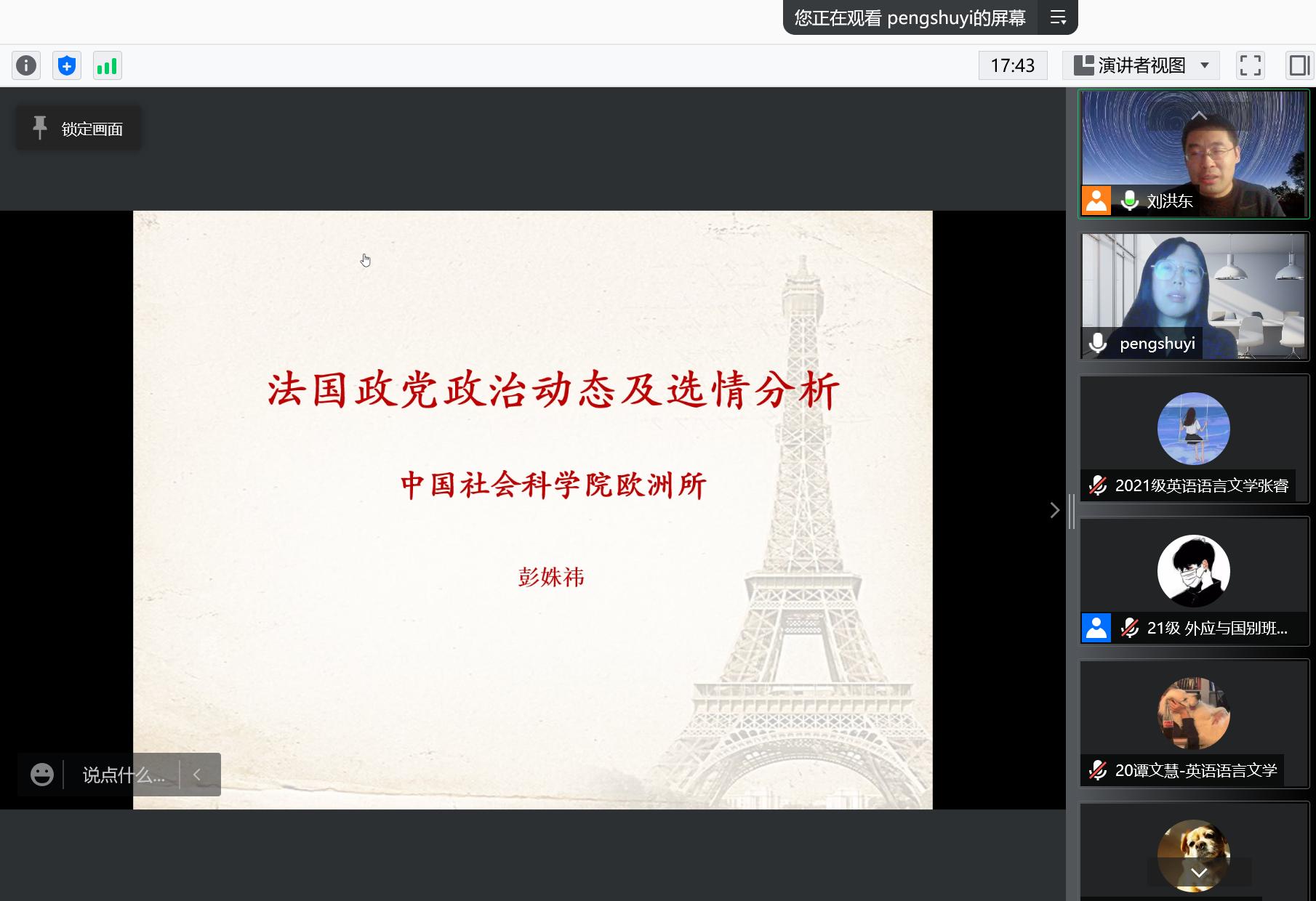 11月25日晚,1929cc威尼斯“百廿山大,九秩外院”系列学术报告顺利举办。中国社会科学院欧洲研究所研究员彭姝祎做客1929cc威尼斯“语翼论坛”,通过腾讯会议线上平台进行了主题为“法国政党政治动态及选情分析”的学术报告。本次讲座由1929cc威尼斯副院长刘洪东主持,来自校内外的200余名师生共同参与本次讲座。