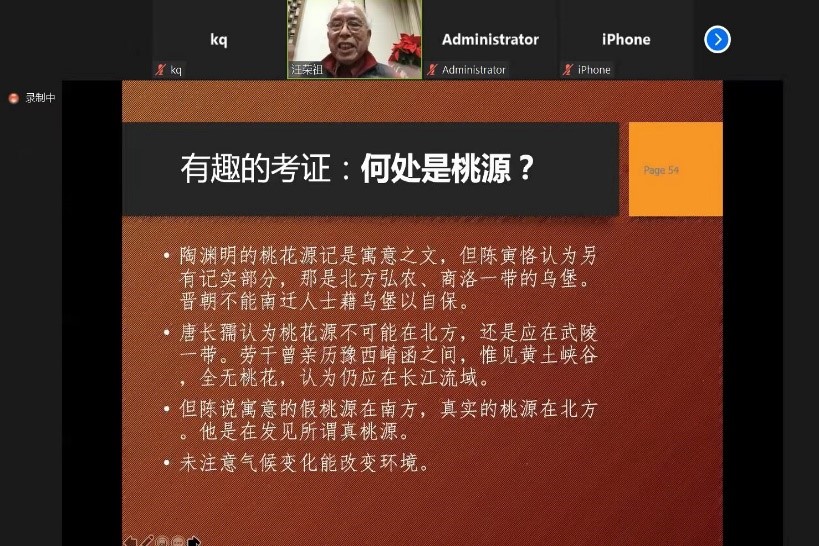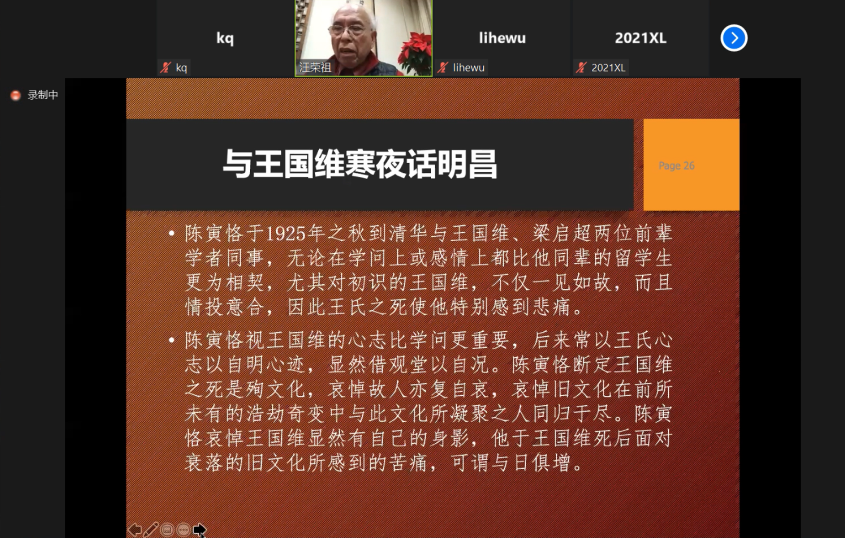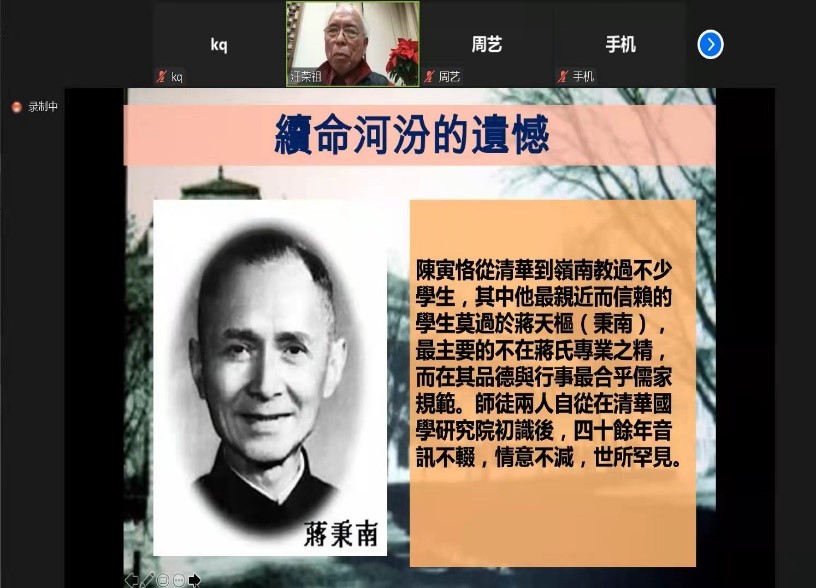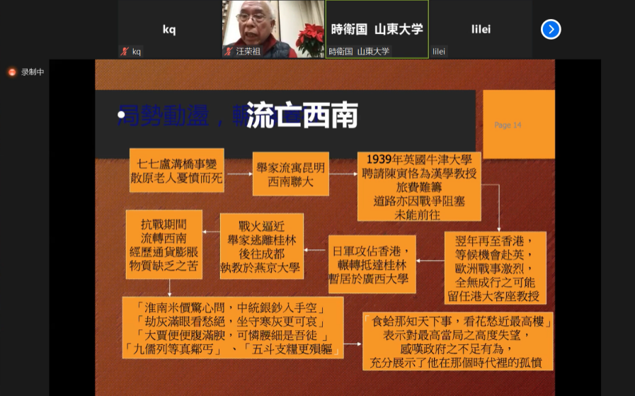 12月17日晚,著名历史学家、1929cc威尼斯儒家文明省部共建协同创新中心访问学者、美国维琴尼亚州立大学荣誉教授汪荣祖应邀做客东方文化大讲堂通识教育讲座暨“师说讲堂”,通过Zoom线上平台做了“陈寅恪及其中国史研究”的精彩演讲,来自山大校内外的众多师生远程聆听。