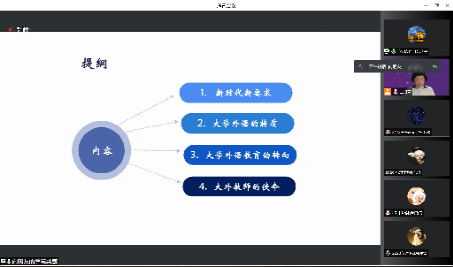 讲座伊始,向明友从历史脉络、实践主题、人民性、民族性和世界性等方面对新时代的内涵进行了深入解读。他分析了新时代对大学外语教育提出的新要求,共包括民族复兴和全球治理背景下人类命运共同体的构建、新文科建设、全员思政和教育信息化建设等四个方面。随后向明友对大学外语的特质进行了论述,强调大学外语兼具工具性和人文性,更是工具性与人文性的统一。新时代大学外语教育应实现“工具”和“人文”的有机统一,以提升能力和强化思政为根本任务,培养有能力、有理想的合格社会主义接班人。关于大学外语教育的转向,向明友认为应践行“一精多会”的方针,即精通英语的同时加强多语种学习;外语学习的意义已由掌握语言知识、技能过渡至如今的国际传播能力建设;英汉互译齐头并进的同时,应对汉译英给予更多重视;在进一步深入了解西方的同时,更应传播中国文化,让西方更多地了解中国;在实现“工具性”和“人文性”并重的基础上,要将思政教育贯穿大学外语教育始终。最后,向明友指出了大学外语教师的四大使命,即落实破五唯、提升综合要求,提升信息和信息化素养,促进课堂改革、提升教育能力以及向促知识结构转变。
