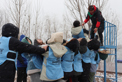 第一个项目是团队热身,每名女生代表一元,每名男生代表五角,根据给出的人民币数额进行抱团。学生们兴致盎然、斗志满满,热火朝天地进行游戏,即便天气寒冷、大雪纷飞,气氛却很快热闹起来。第二个项目是达芬奇密码,每队挑选十人传递信息,由各队挑一名队长监督对方。在朱吉伟给出数字或成语的信息后,队员们按照每轮的规则要求进行传递。信息在传递过程中不免产生偏差,在公布结果的那一刻,现场欢声笑语、热闹非凡,大家在这一项目中深刻地理解了团队沟通的重要意义。第三个项目是信任背摔,在这个项目开始之前,朱吉伟和高艳亮向大家讲解标准姿势和注意事项,然后分别带领两队成员前往背摔设施。背摔台上积了一层白雪,冷风肆虐,大家在寒风中不停地跺脚,对这个项目能否顺利进行产生深深的担忧。刘智泉首先站上背摔台,作为第一位参与者向大家做出示范。然后,大家在教练的鼓励下分成几组,无惧严寒,出色地完成了这一项目,展现了团队成员们强大的心理素质和对彼此的信任,拉近了队员们间的距离。