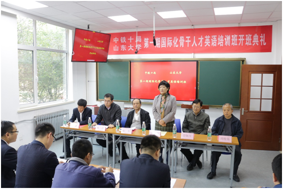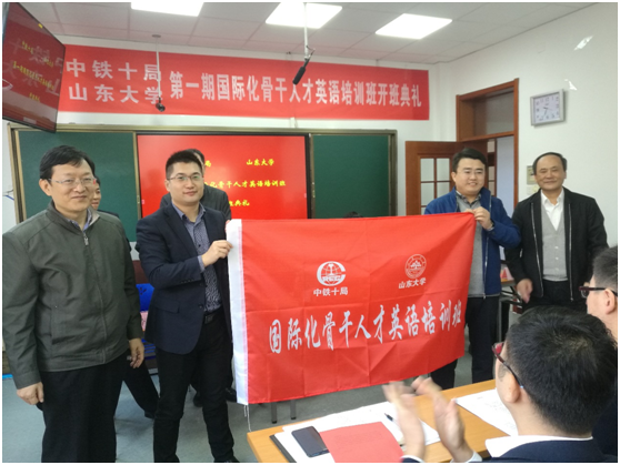 首先,王俊菊院长致辞。她介绍了学院的基本情况和外国语言文学学科的发展情况,强调了外语的学习方法,鼓励学员们用英语的思维来学习, 希望在校企双方的共同管理下办好此次培训班;随后,中铁十局集团有限公司副总经理崔军介绍了本次培训班的开班意义和集团海外业务的发展情况,勉励学员们不负嘱托、勤奋学习、珍惜机会,拓展自己,提升自身综合素养,并在管理上对学员提出了要求;之后,主持人宣布班委组成,薛佩军及崔军向班委授班旗,班委进行了宣誓。典礼结束后,全体与会人员在楼前合影留念。